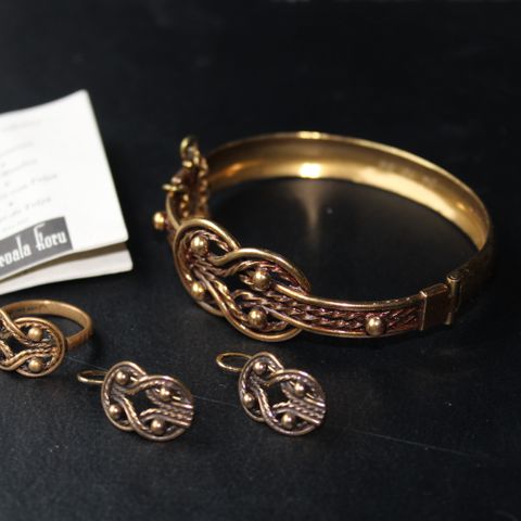 Korvakorut + rannekoru pituus n.20 cm. Pronssinen korusetti punaisella kivellä. Vintage korut, vintage koru, Kalevalakoru, Pronssiset korut.