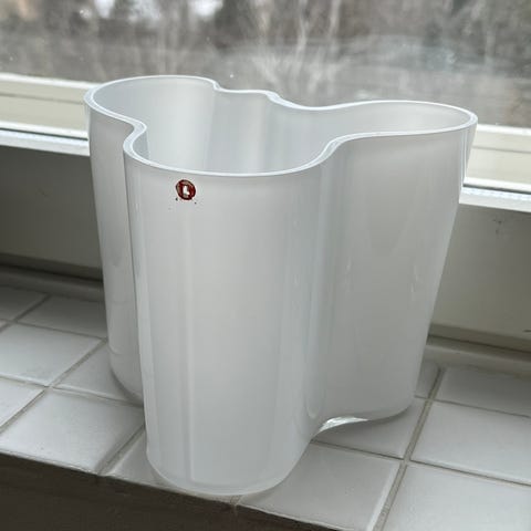 Vasemmanpuoleinen: käyttämätön/hyvin vähän käytetty ehjä ja hienokuntoinen Aalto Savoy maljakko, 160mm, Iittala tarra sekä pohjassa Alvar Aalto Iittala, purppura, ei lohkeamia tai halkeamia, pieniä siirtelyjälkiä pohjassa, 250e