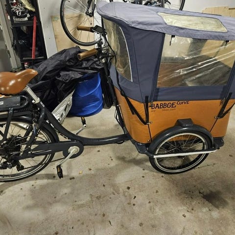 Myydään sähköavusteinen Babboe-lastenlaatikkopyörä, joka on edelleen erinomaissa kunnossa.