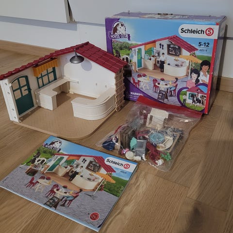 Schleich hoitola/ kauppa. Sisältää kuvassa näkyvät tavarat/ huonekalut.