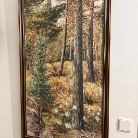 Maisemamaalaus taulu, jossa näkyy vuorimaisema, metsä ja järvi. Teos on kehystetty puukehyksellä, jossa on kiinnityslanka. Kehyksen takapuoli näkyy toisessa kuvassa.