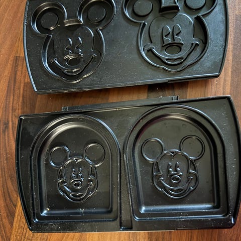 Disney Mickey Mouse vohvelirauta musta ja hopea väri. Vohveliraudassa on Mickey Mouse -aiheiset kuvioidut levyt.