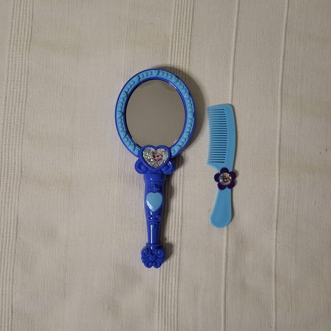 Ihana Elsa Frozen-teemaisessa peilissä. Peiliosassa jonkin verran naarmuuntumaa mutta toimii. Voidaan ripustaa seinälle. Käytön jälkiä näkyvissä.