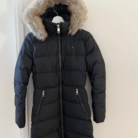 Tommy Hilfiger pinkki/fuksia untuvatakki, koko S. Todella hyväkuntoinen, minitahra takana, tästä kuva. Kainalo-kainalo noin 50 cm, pituus noin 70 cm. Irroitettava tekoturkis hupussa.