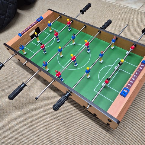 Pöytäjalkapallopeli sinivalkoisilla ja punaisilla pelaajilla