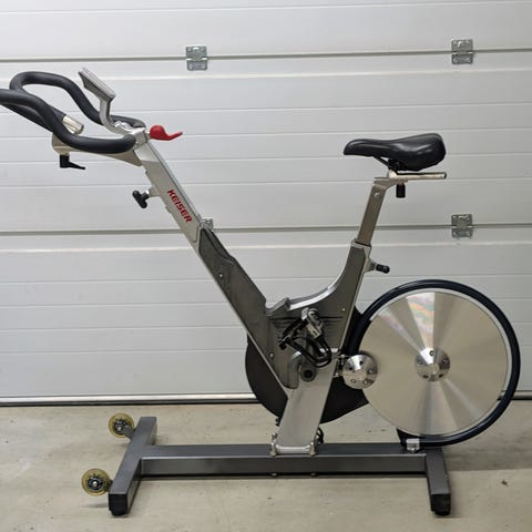 Sisäpyörä, jossa valkoinen runko ja mustat yksityiskohdat. Soveltuu sisäpyöräilyharjoitteluun. Varustettu säädettävällä satulalla ja ohjaustangolla. Rakenne mahdollistaa tehokkaan harjoittelun kotona.