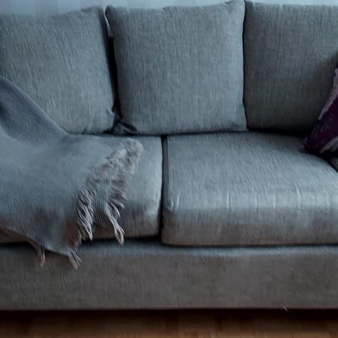 Pitkä kaareva sohva, kissataloudesta (raapimisjäljet huomioitu hinnassa).