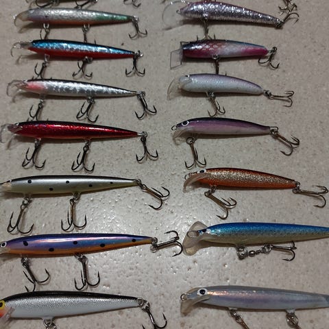 2-puolinen rasiallinen uistimia taimenelle (mm. Puikkoja, kevennettyjä lusikoita, rannikkovaappuja + peltejä)