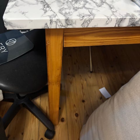 Kevyt kantaa, pinnassa jälkiä jotka ei lähde. Sekä vaalentumia ja naarmuja, sopiva ehkä perheelle jota ei haittaa jäljet tai työskentelytilaan esim pöydän päällä maalaus yms.