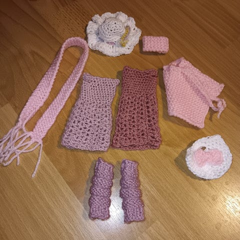 Virkattuja mekkoja, laukkuja, hiuspanta,pipo, säärystimet,