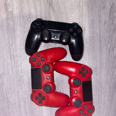 Sony DualShock 4 langaton ohjain, musta väri. Sopii PlayStation 4 -pelikonsoliin. Ohjaimessa näkyy käytön jälkiä, toinen ohjain on osittain teipattu.