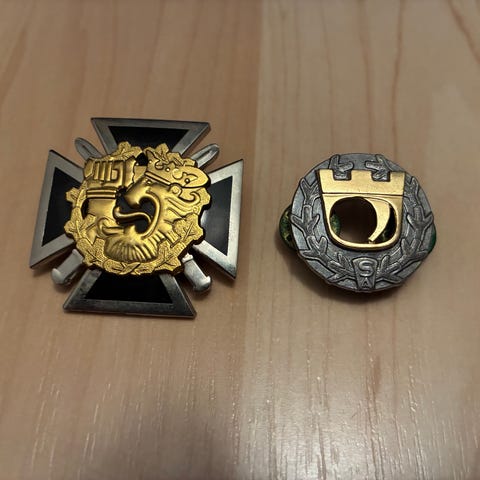 Koko 28mm, kullanvärinen (ehkä kultaa?) kuva keskellä, ympärys koristeellista harmaata metallia leima SA, kaksi kiinnitysnappia, täysin ehjä ja siisti