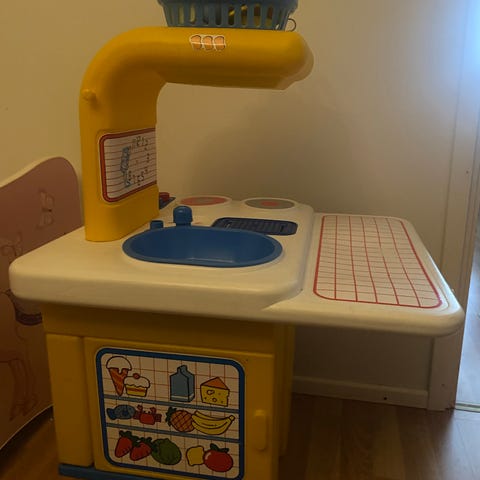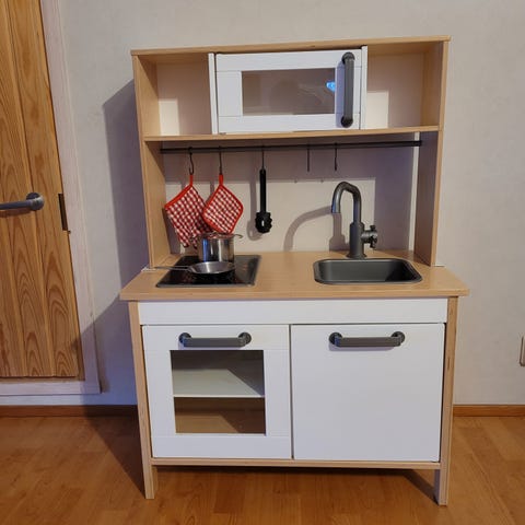 Leikkikeittiö seuraavalle kokkailijalle. Keittiötä on hieman tuunailtu mm. ovenkahvoilla, työvalolla sekä sivussa olevalla naulakolla. Keittiössä hieman käytönjälkeä esimerkiksi työtasossa. Tässä ei myöskään toinen liesi ole toiminut koskaan, vaikka sitä yritetty korjata, mutta eipä ole käyttöä haitannut. Mukaan keittiön korokkeet sekä muutamat kokkailuvälineet.