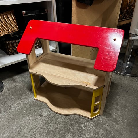 Nukkekodin yöpöytä, jossa on aukeava laatikko. Pöydällä on viherkasvi.