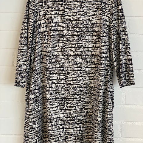 Puuvillasekoitetta. Tuotteessa on ohut vuori. 3/4 pituiset hihat. Vetoketju takana. Vaatteessa on taskut. A-linjainen malli. Kiva kuosi. Käy töissä ja juhlissa.