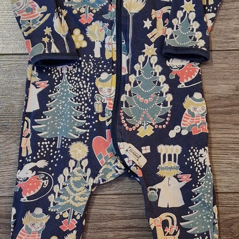Uusi Muumi by Martinex Talvyö vauvojen pyjama koossa 74. Miellyttävän pehmeästä kankaasta valmistettu vauvojen Muumi-aiheinen joulupyjama. Pyjamassa on pitkät hihat ja pukemista helpottava pitkä vetoketju.