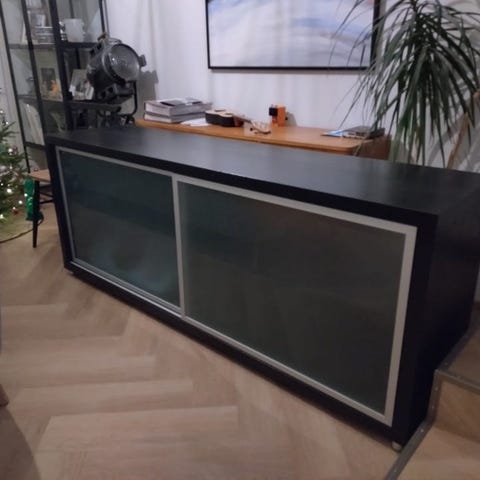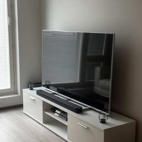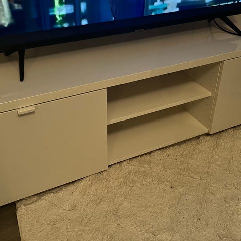 IKEA TV-taso, jossa on valkoiset ja punaiset pinnat. Huonekalu soveltuu television ja pelikonsolien sijoittamiseen. Sisältää säilytystilaa avoimissa ja suljetuissa osioissa.