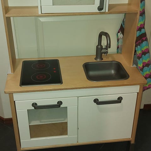 Hyväkuntoinen leikkikeittiö, mukaan löytynee joitakin keittiöön sopivia keittiövälineitä. Kasattuna tai osissa.