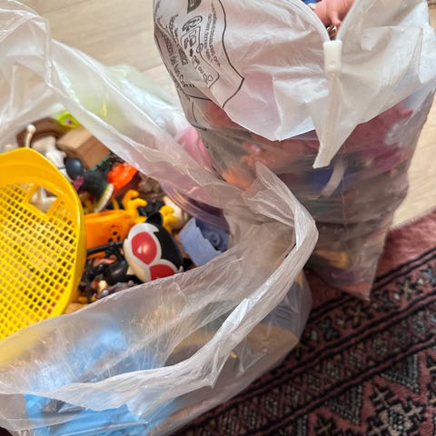 Annetaan kuvan mukainen kassi käytettyjä leluja. Lelut ovat ehjiä.