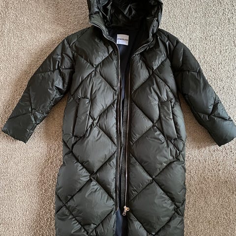 Uusi Lempeliuksen toppatakki. Koko XS/S, mutta oversize-mallia. Huppu kaninkarvaa.