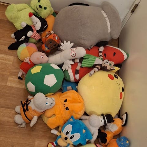Erilaisia pehmoja jätesäkillinen. Sisältää Muumia, Sonic, Among us yms. Vanhempia ja uudempia pehmoja
