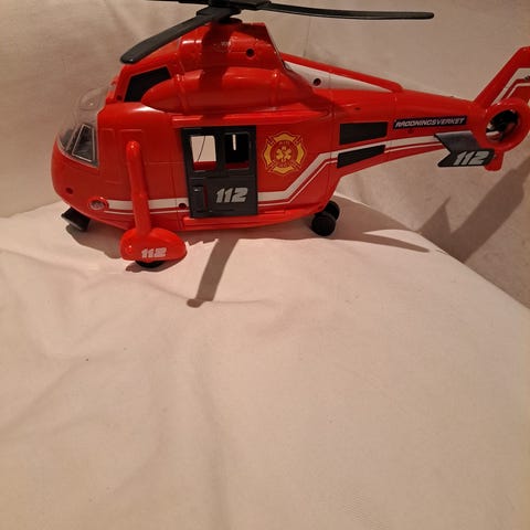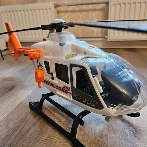Kopterin osat kaikki tallessa ja muuten toimii hyvin, mutta vinssi mennyt rikki. Äänet ja valot. Katolla olevat ropelit pyörii napista painamalla. Myös hakkuja voi lennättää nappia painamalla.