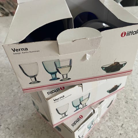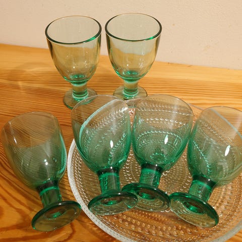 Iittalan täysin ehjät ja erittäin hyväkuntoiset, uudenveroiset Verna juomalasit syvän vihreän värissä. Kolmessa vanha I tarra jäljellä.