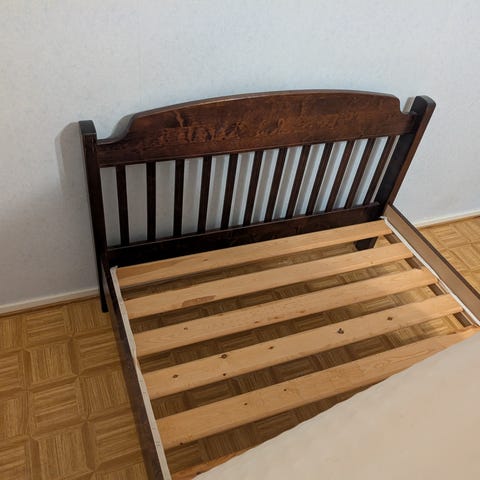 Myydään puinen yhden hengen sänky patjan kanssa.