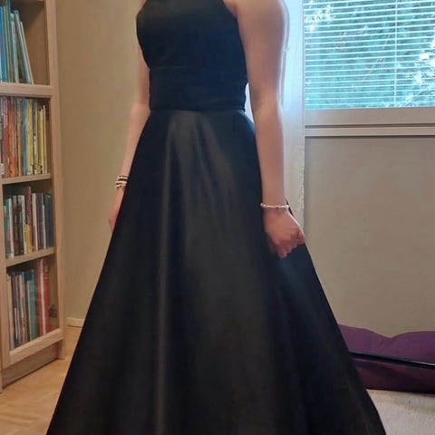 Tampereen Lavemista talvella 2024 ostettu ja kerran käytetty musta vanhojentanssipuku ja siellä mittojen mukaan pukusuunnittelijan muokkaama. Ollut noin 155 cm pituisella tanssijalla. Takana nyörikiinnitys. Musta vannehame mukaan. Yhdet vanhojentanssit tanssittu. Hinta uutena 500 eur + vannehame. Tyylikäs ja näyttävä.
