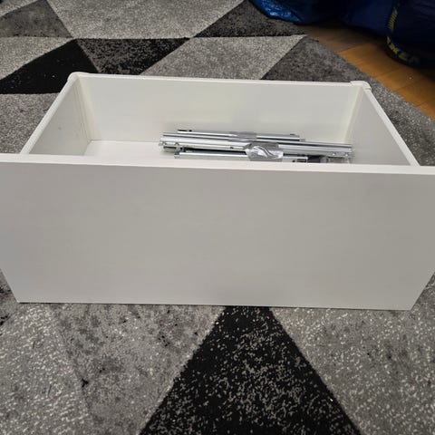 Vanhempaa mallia olevat Bestån kaksi valkoista korkeakiiltoista laatikkoa. Laatikot ovat sopivia uusiinkin Bestån runkoihin.