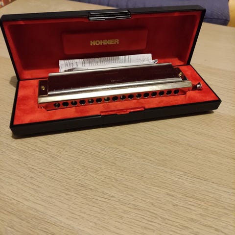 Hohner Kreuzwender "siipiratas" huuliharppu. Käyttämätön, hyvin säilytetty vuodelta 1965. Isäni 30-vuotis lahja, jota ei raaskinut edes kokeilla. Tarkemmat tekniset tiedot osoitteessa: https://www.thomann.de/fi/hohner_kreuzwender.htm
