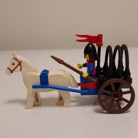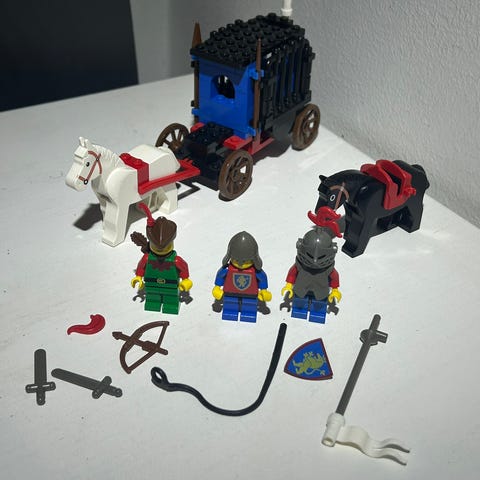 Myydään LEGO System sarjaan kuuluva tuote. Tuotenumero 6027. Ritari, jolla miekka ja kilpi sekä hevosvankkurit.