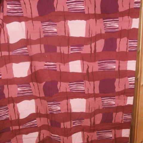 Kaunis punaisenruskea puuvillakangaspala sisustukseen. Leveys 130 cm, pituus n 83 cm. Kuviossa eläimiä, kasveja, ratsastajia jne. Painettu kangas. Kangaspalan reunat ovat valkeat. Postitus tai nouto.