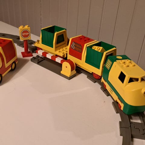 Myydään hyväkuntoinen duplopaketti,joka pitää sisällään mm. junaradan, kaksi junaa ja auton. Kuvissa näkyy kaikki pakettiin kuuluva sisältö.