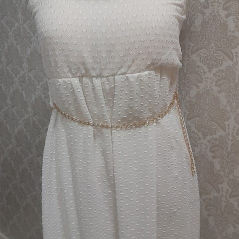 Vaaleanpunainen pitkä satiini nauha kuuluu mekkoon ja tulee mukaan.