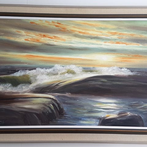 Canvaspohjalle toteutettu merihenkisen raikas maalaus. Oltuaan kodissani vuosia on tämän teoksen aika saada paikka toisesta yhtä rakastavasta kodista. Ostin tämän suoraan paikalliselta taiteilijalta vuonna 2022.