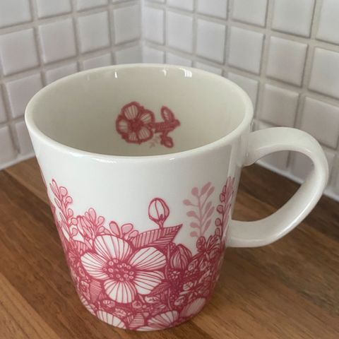 Arabia Huvila 2017 muki, valmistettu posliinista, valkoinen ja punainen väri.
