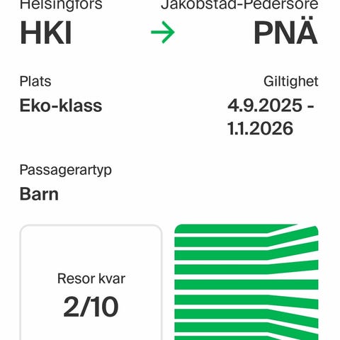 Myydään junamatka lapsen sarjalipulta. Lippu käy kaikilla asemilla Pietarsaari-Helsinki / Helsinki-Pietarsaari välillä. Matkustusaikaa on 1.1.2026 saakka.