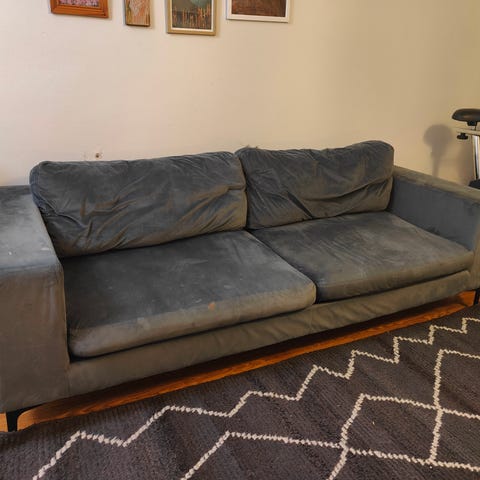 Tästä mukava, hieman elämää nähnyt beige alcantara sohva nopeimmalle. Pelkkä nouto, hae pois