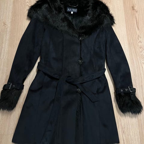 Musta mokkanahka jäljitelmä päällystakki. Sisäpuoli sileäkarvainen tekoturkis. Koko takissa EU 44, USA 8, vastaa mielestäni n. kokoa 38-40. Hihojen sisäpuolella myös tekoturkiskarvoitus, joten mitään paksumpaa puseroa esim. villapaitaa ei kannata yhdessä takin kanssa käyttää. Kaksoisrivinapius, toinen rivi sisäpuolella. Kiinteä kasvareunus huppu. Hihansuissa myös karvaresorit soljet. Solmittava vyö. Sivutaskut molemmin puolin.