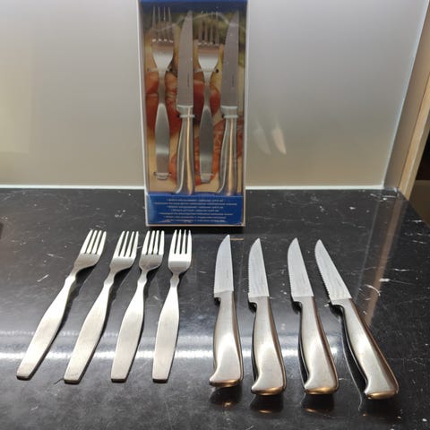 Hackman Gourmet-sarjan pihviveitset ja pihvihaarukat. Materiaali: mattaharjattu ruostumaton teräs.