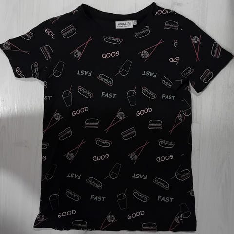 Hyväkuntoinen (lähes käyttämätön, pesulapussa merkintä), pitkähihainen Me & I -paita. Musta, c-kasettikuvio. Party mix. Play. Koko 158/164.