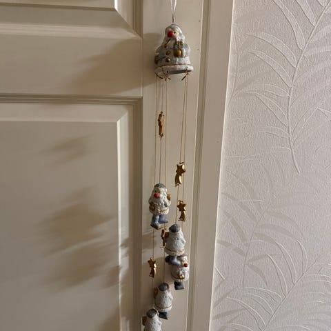 Vanha käsintehty joulukoriste missä neljä tonttu roikkuu köydessä missä on myös punainen toimiva vanha joulukello. Pituus on noin 110cm.
