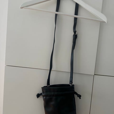 Todella vähän käytetty, musta, topattu laukku, pitkällä ja säädettävällä hihnalla. Ulkopinta mustaa, hieman ”muovimaista” materiaalia ja sisäpuoli beigeä kangasta. Ulkopuolella kaksi vetoketjullista taskua ja sisäpuolella tilanjakaja sekä kaksi avonaista ja kaksi vetoketjullista taskua.