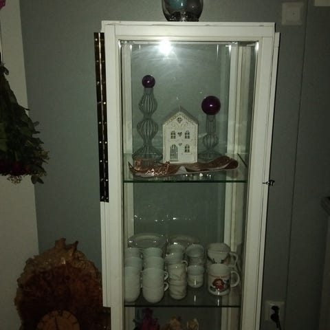 Vitriini. Leveys 136cm, korkeus 112,5cm, syvyys 44cm. Lasiovet. Lasihyllyt. Kaksi valkoista puuovea. Käytön jälkiäkin löytyy jonkin verran. HUOM! Ei voi purkaa (ei mahdu esim. moneen farmariautoon). Lasiovet ja hyllyt saa irti kuljetuksen ajaksi. Kuvan kuljetus alusta ei sisälly hintaan. Ennen joulua hakevalle 50 eurolla pois.