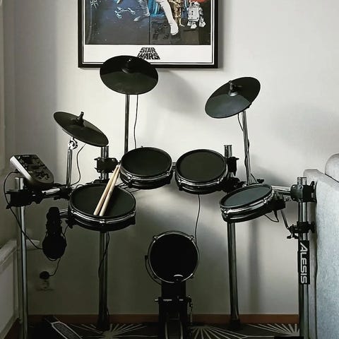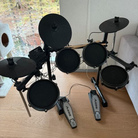 Sähkörumpusetti sisältää useita kalvopadeja ja kumisia symbaalipadeja, jotka on kiinnitetty tukevaan mustaan metallitelineeseen. Setissä on mukana erilliset pedaalit bassorummun ja hi-hatin ohjaukseen. Rumpupadeissa on krominväriset vanteet ja valkoiset isku-/soittopinnat.Kick, 3 toms, with ride, crash, HiHat cymbal pads and a dual-zone snare.Moduuli puuttuu.Valmistaja: AlesisVäri: musta, hopeaMateriaali: metalli, muovi, synteettinen materiaali