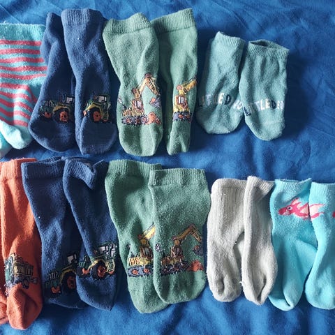 Noin 20-22 kokoiseen jalkaan sopivia sukkia 7kpl. Kolmet jarrusukat, kahdet tavalliset ja yhdet Ruskovillan punaiset villasukat.