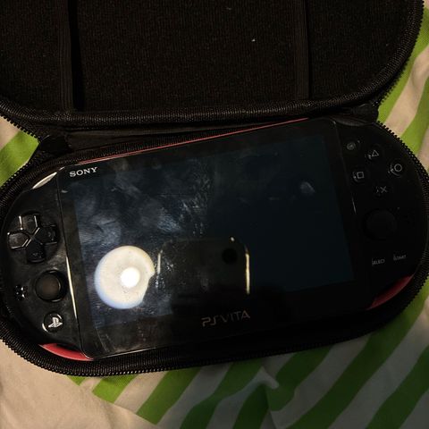 Sony PS Vita pelikonsoli musta väri. Kannettava pelikonsoli, jossa on kosketusnäyttö ja fyysiset ohjaimet. Mukana suojakotelo, tarvikelaturi ja muistikorttiadapteri jossa 128GB muistikortti.