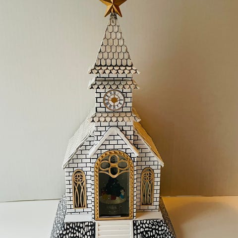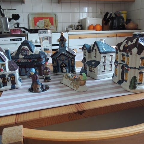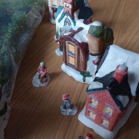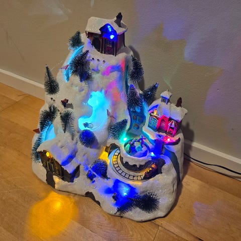 Jouluinen kylä valaistuksella ja musiikkiefektillä. Musiikin saa kytkettyä pois päältä. Päällä ollessa pitää kurinaa kun liikuttaa poroja ja joulupukin rekeä.