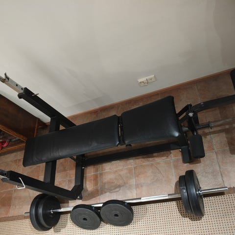 Painonnostotanko ja levypainot. Setti sisältää tangon lukkoineen ja 4 kpl 10